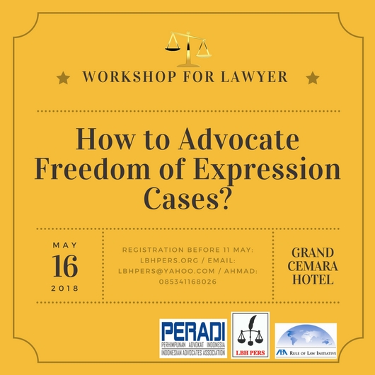 LBH Pers dengan dukungan dari American Bar Association Rule of Law Initiative (ABA Roli) dan bekerjasama dengan Perhimpunan Advokat Indonesia akan menyelenggarakan workshop kebebasan berekspresi di Internet untuk advokat dalam satu hatu hari. Adapun materi yang akan disampaikan di dalamnya adalah tentang norma-norma kebebasan berekspresi internasional dan nasional, pembatasan kebebasan berekspresi dan alat bukti elektronik dan strategi pembelaan dan argumentasi di pengadilan dalam kasus-kasus kebebasan berekspresi di Internet.